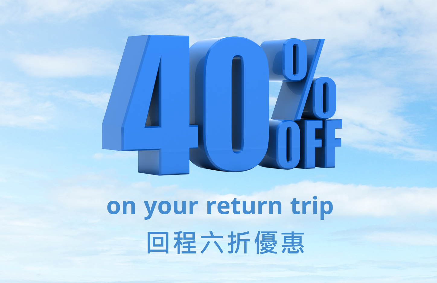 First time travelers can enjoy 40% off on return trip. Save HK$1,660!